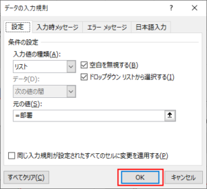 入力規則のリストを別シートから参照する Excel 2024.06.27 リスト入力を別シートから参照してプルダウンを作成 リスト入力を別シートから参照してプルダウンを作成 プルダウン用のデータを別シートに作成 対象のセルを選択、名前を定義します 「データ」タブ → 「データの入力規則」マーククリック 「データの入力規則」フォームが表示されます 入力値の種類を「リスト」を選択 元の値を設定します 直接、定義した名前を指定 =[定義した名前] =部署 名前を定義しない場合は、事前に用意した データを選択します